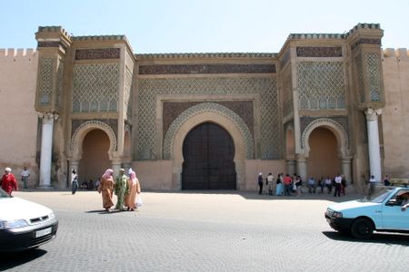 Bab Mansur, la puerta suroriental con sus decoraciones de filigranas sobre cerámica verde, es la más majestuosa de las puertas de las ciudades imperiales. Es la principal entrada a la ciudad y fue construida en la etapa de Moulay Ismaïl.